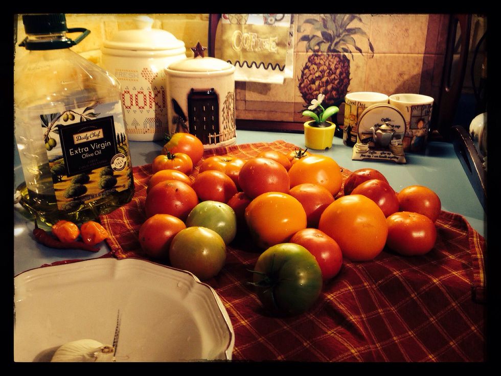 I use tomatoes in all stages from green to ripe and one or two heads of garlic depending on how I feel.