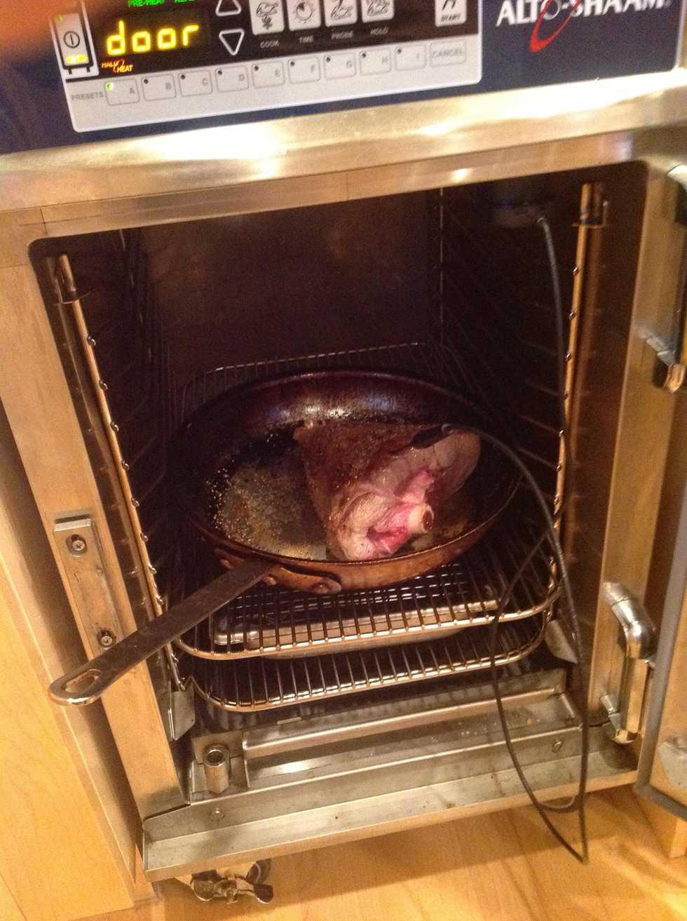 Roast in the Alto-Shaam cook & hold. For medium rare Cook temp 250F (121C) Probe cut off 105F (40C) Hold temp135F (57C) Hold 1-8 hrs. Longer hold time = more tender