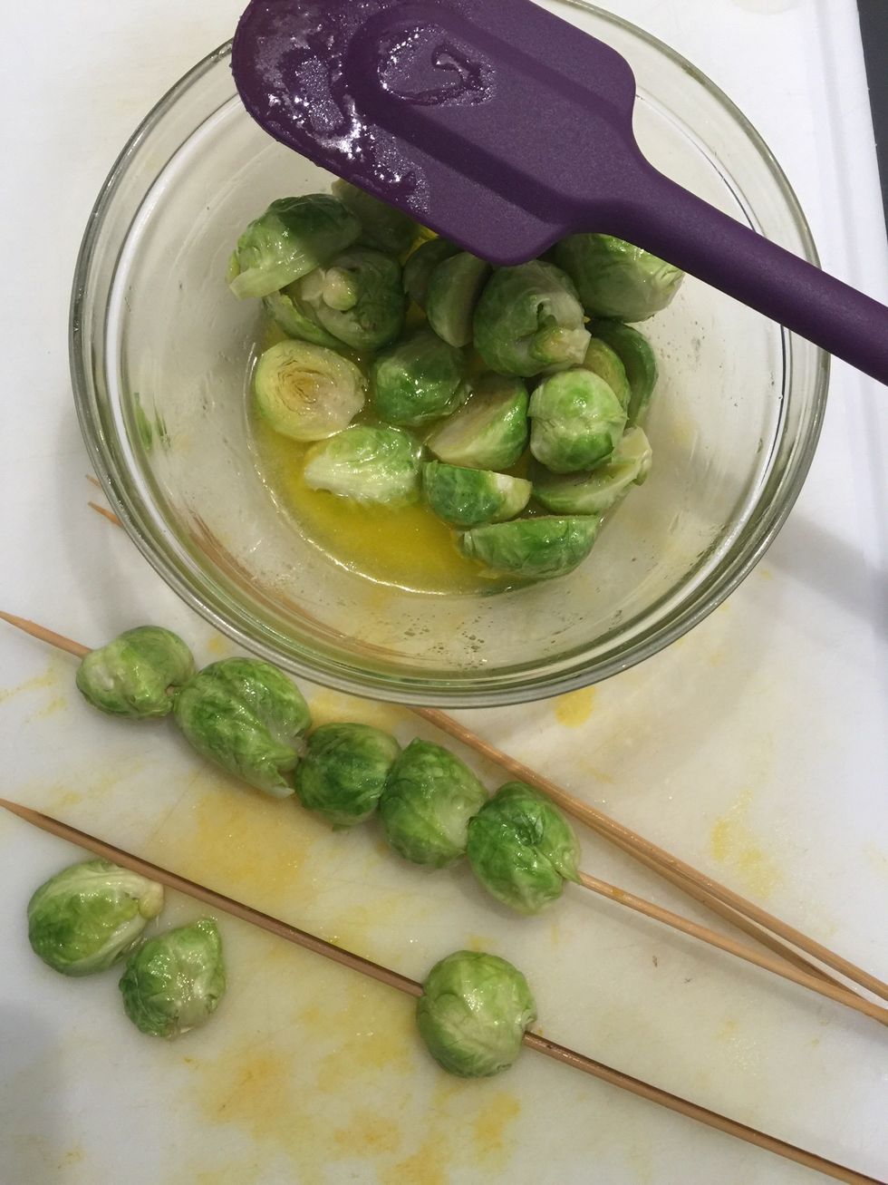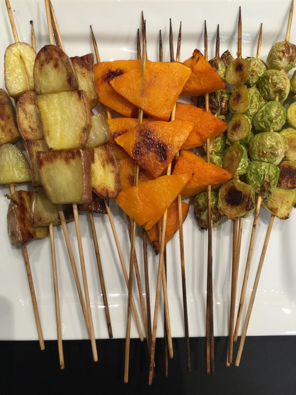 Ingredients for 6.. Each 3 skewers. Brussel sprouts (5 halves/skewer). Potatoes (4 quarters/skewer), Pumpkin (3 triangles/skewer), shallots (3 pieces/skewer)
