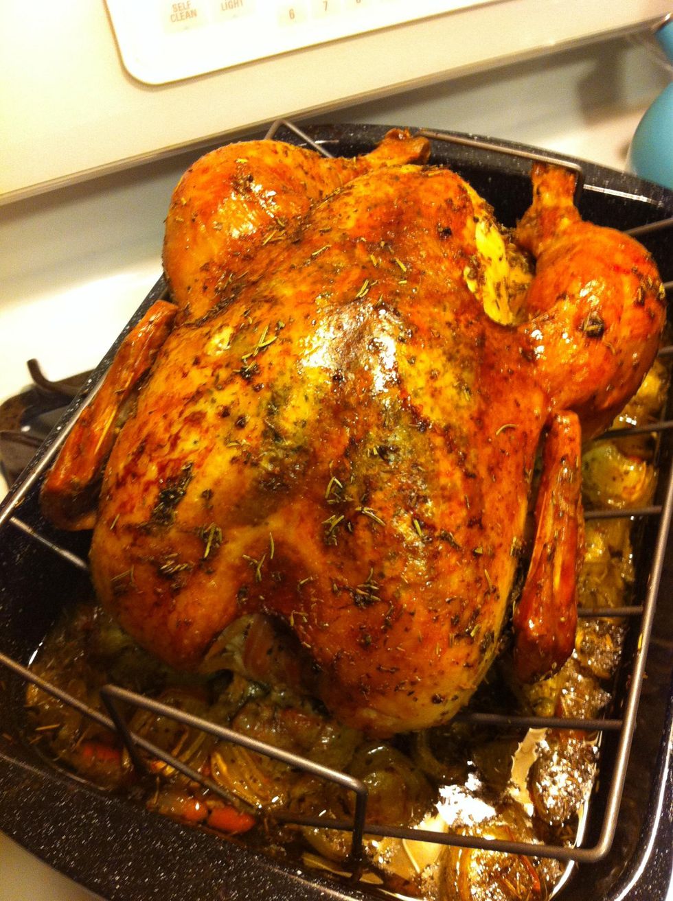 And viola! Your turkey is done when it temps to at least 165 F in the thickest part of the breast meat. Let your bird rest for at least 20 minutes or you'll lose a lot of the juices.