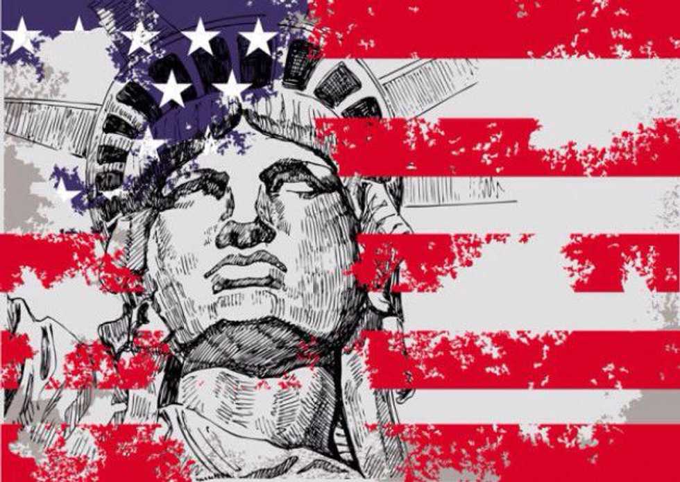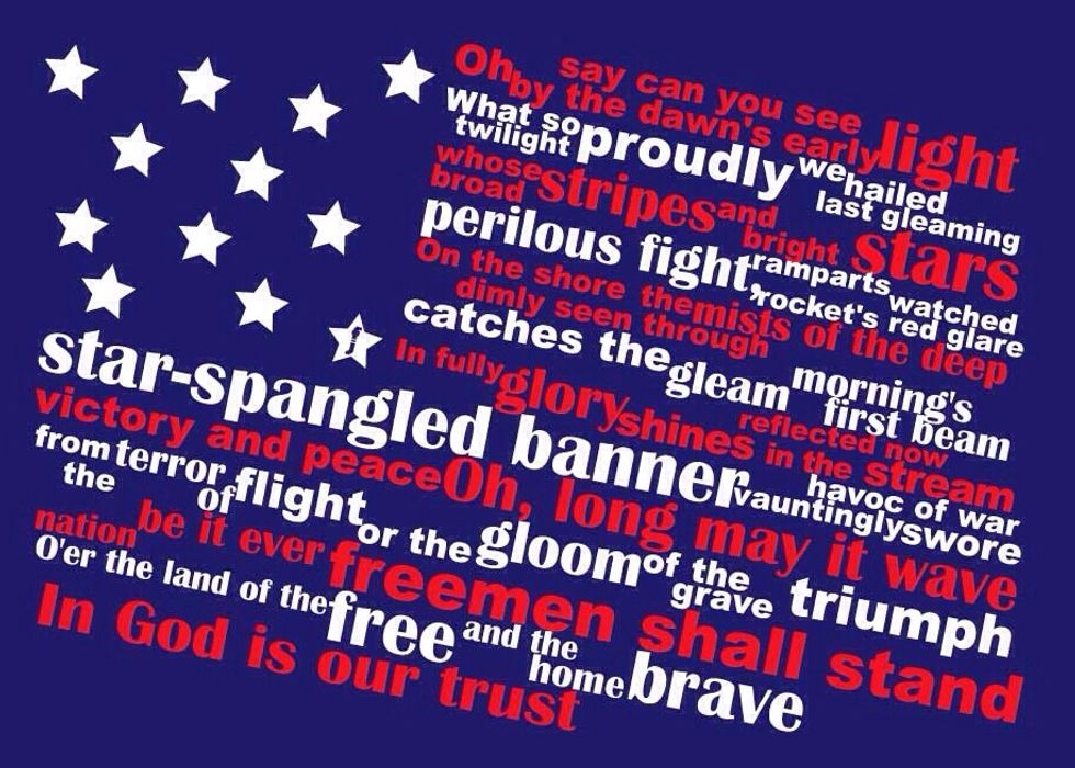 La bandera de los Estados Unidos consta de trece barras horizontales, 7 rojas y 6 blancas, y un rectángulo azul con cincuenta estrellas blancas.