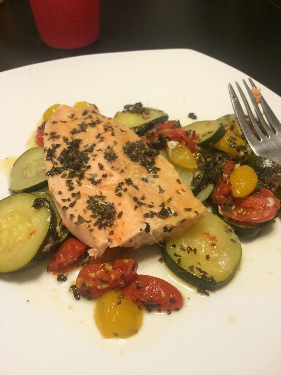 Slice half a zucchini per foil wrap 1/2 cup tomatoes per foil wrap Add to foil Add T of basil Add fish Add olive oil Add salt and pepper Wrap foil Bake at 350 for about an hour Plate and eat