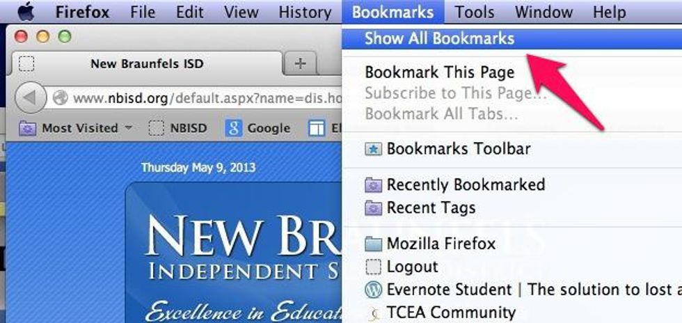 On the Firefox menu bar, select "Show All Bookmarks."