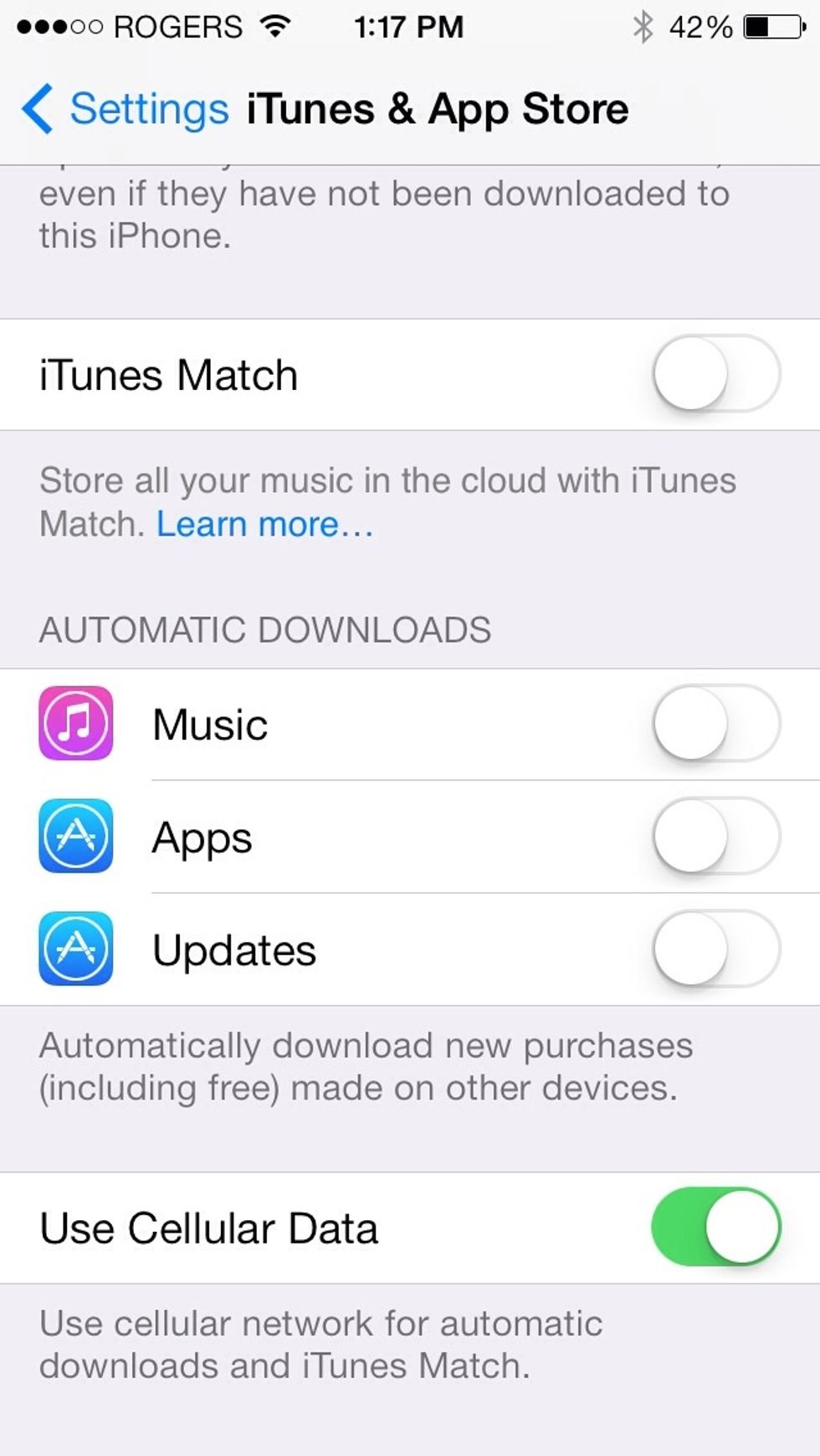 Turn off automatic downloads of music + apps, and updates (new with iOS 7). Go to settings > iTunes and AppStore > Scroll down to automatic downloads and turn all three off