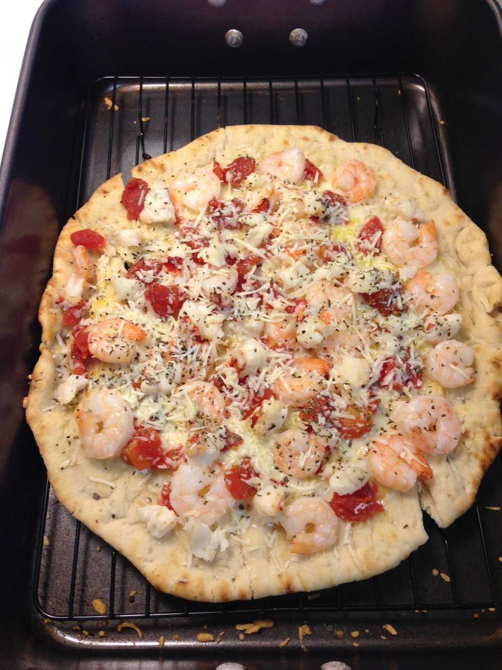 Put the shrimp on the pizza. Cut the lobster in pieces.