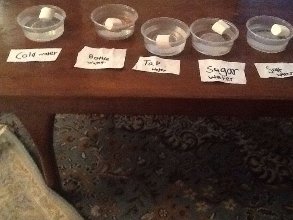 Take one cup ,fill it with cold water, take two other cups and fill them with salt and sugar water. Take Two other cups and fill them with bottle water and tap water and don't forget to name them.