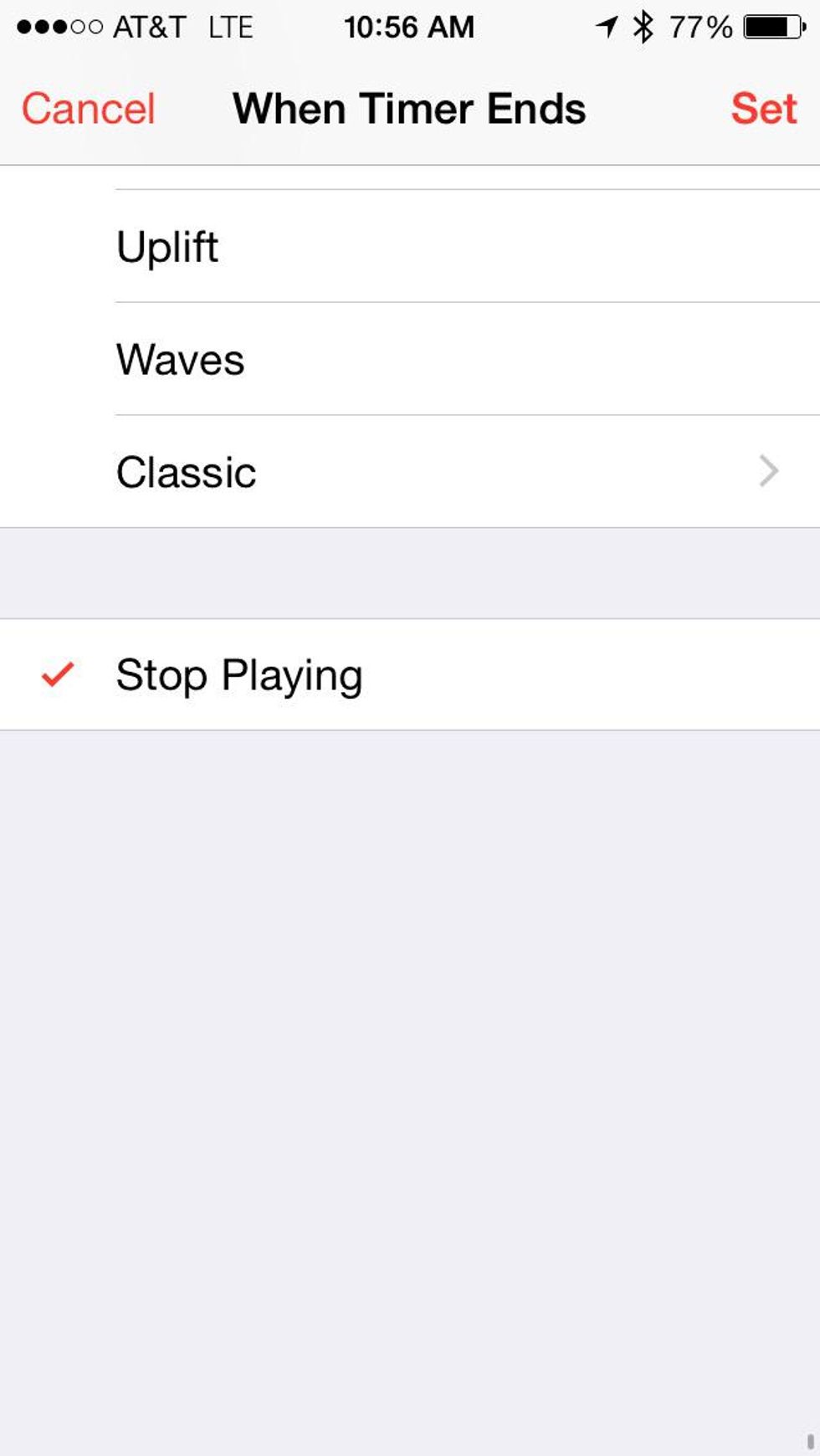 Instead of setting a ringtone to play when your timer goes off scroll to the bottom and select the option, "Stop Playing." Then, select set.