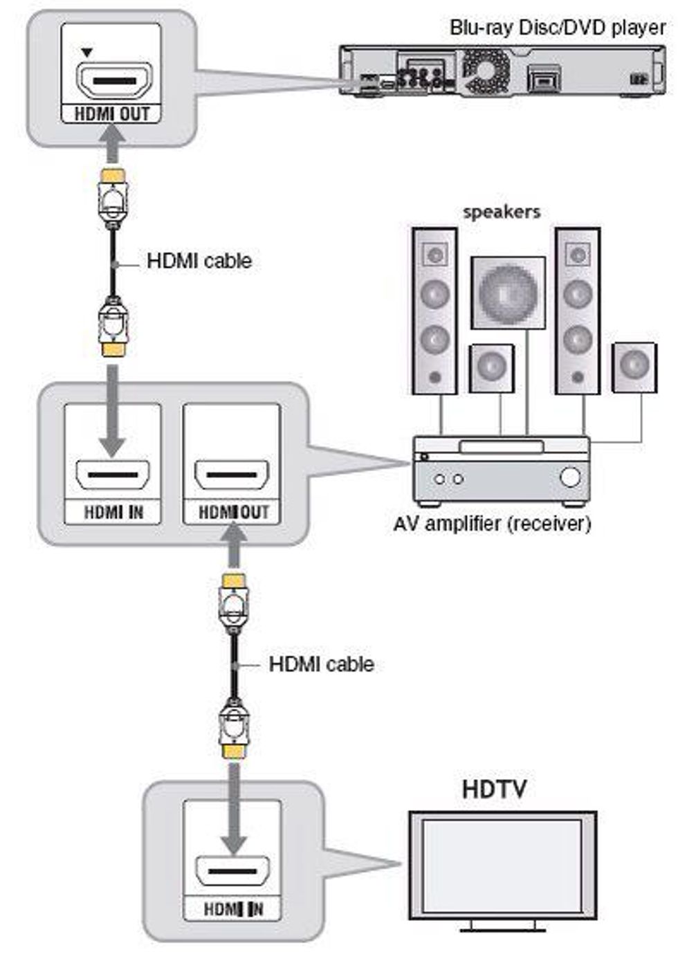 If you have an HDTV Connect your Blu-ray/DVD player to your A/V Receiver using HDMI (if u can) and run another HDMI cable from the Receiver's monitor/video out to the HDTV input.
