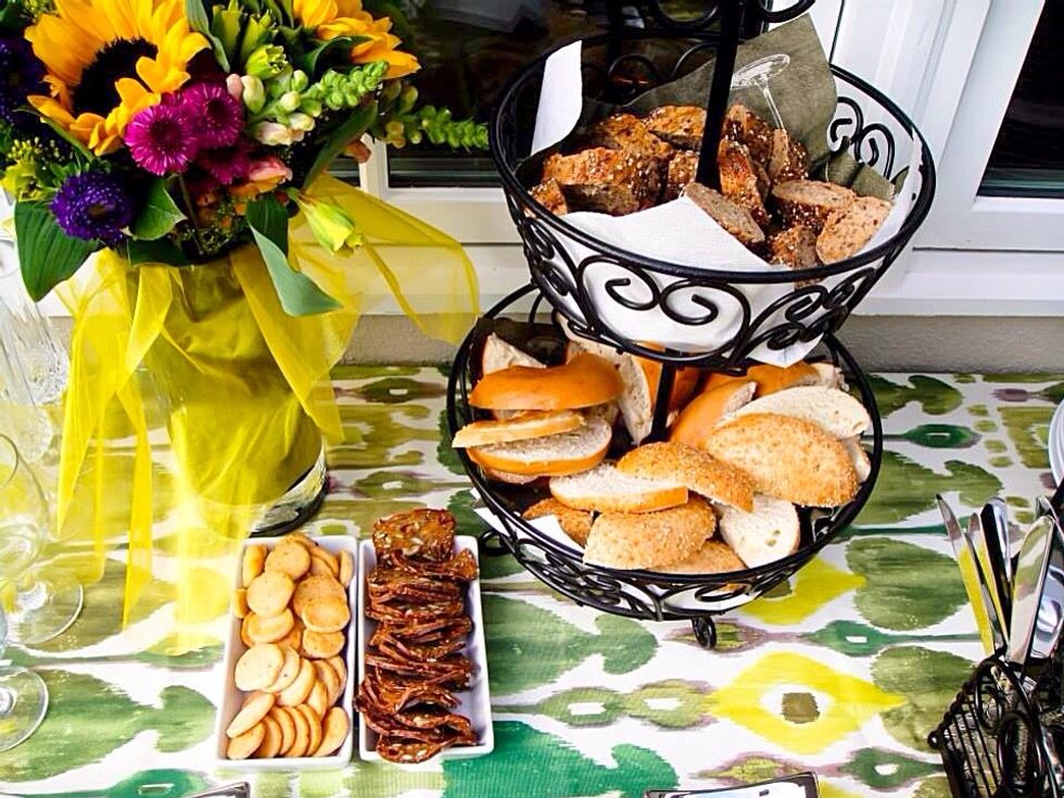 Something to top the bagels or crackers: smocked salmon, cream cheese, sweet soft cheese with raisins, olives and such