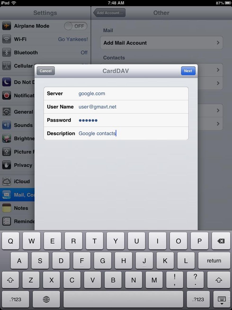 Enter your Green Mountain Access GMail Account username and Password. Make sure the server name is GOOGLE.COM
