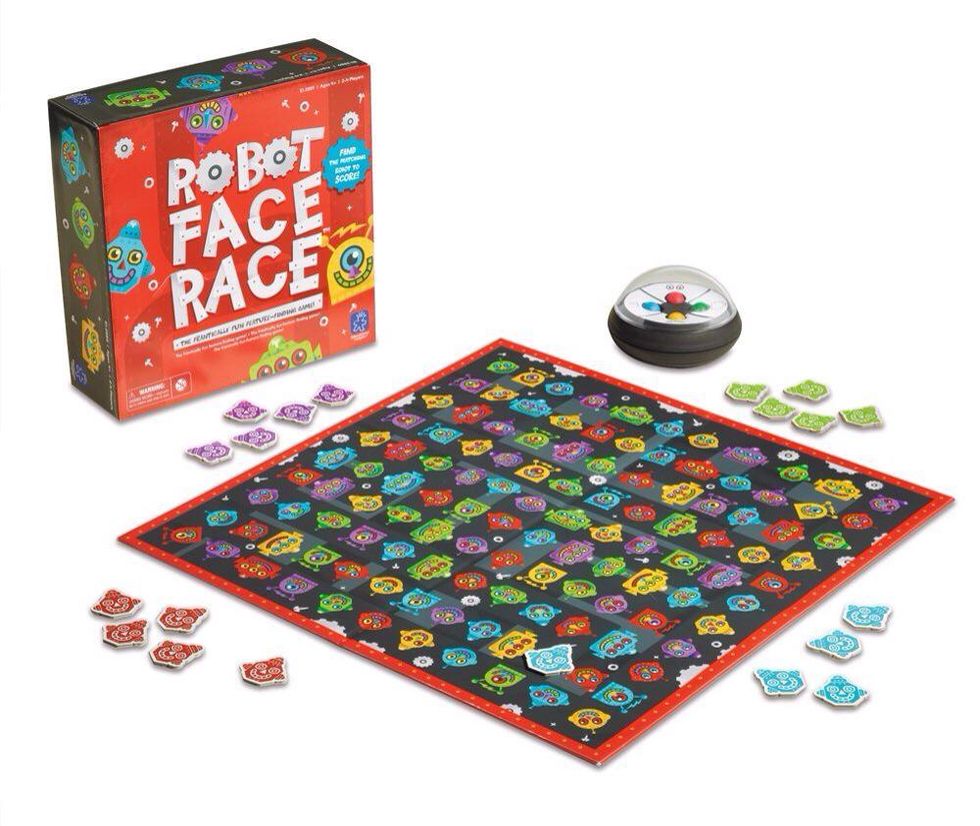 Introduce the game board. Point to a specific robot and ask for information, such as "What color is the robot's face?"