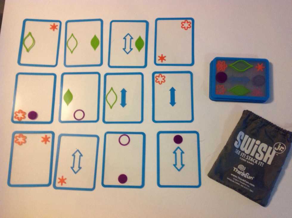 Place 3 cards on the table, with 2 of the 3 cards being a match. Instruct the learner to call out "Swish!" when he/she sees the match, pick up the match, then replace the 2 cards from a draw pile.