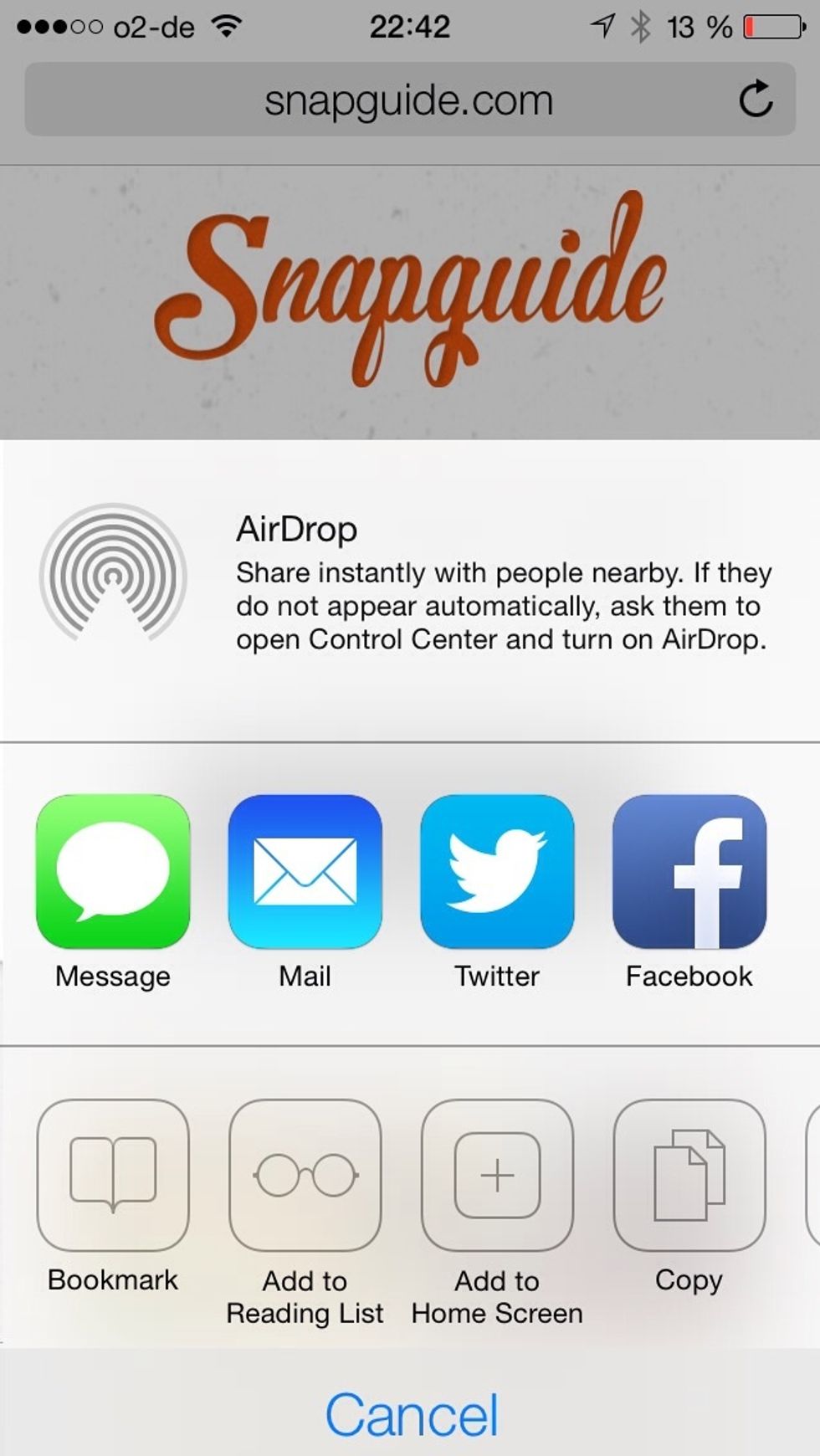 You'll notice "AirDrop" amongst these options - it can send whatever you want to share to a device nearby (for example another iPhone or iPad running iOS7 or your Mac)