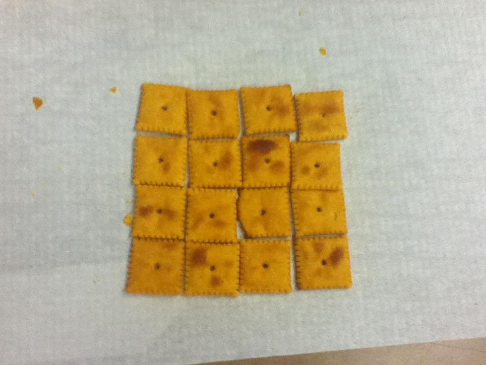 This is a radical made out of cheese nips.These 4 cheese nips represent the length.Then I added for more to the 4 that represent the length.Then I added another 4.Then I added another 4. So now it looks like a square. 4 squared is 16.