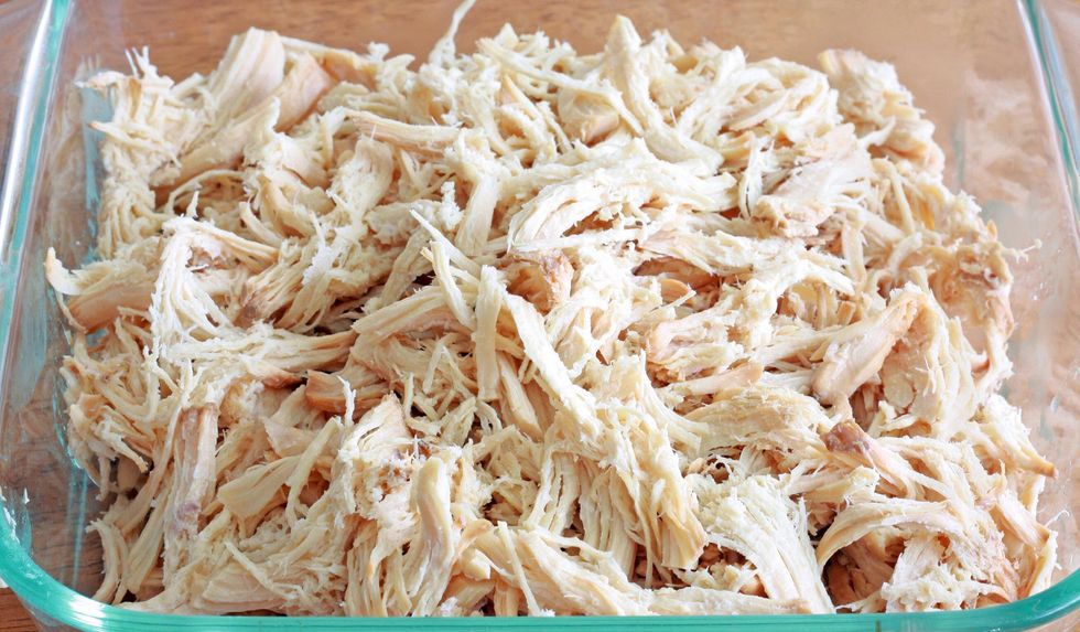 Remove the chicken once cooked and place Into a stand up electric mixer. Add the paddle attachment and turn on slow speed for 5-10 seconds.