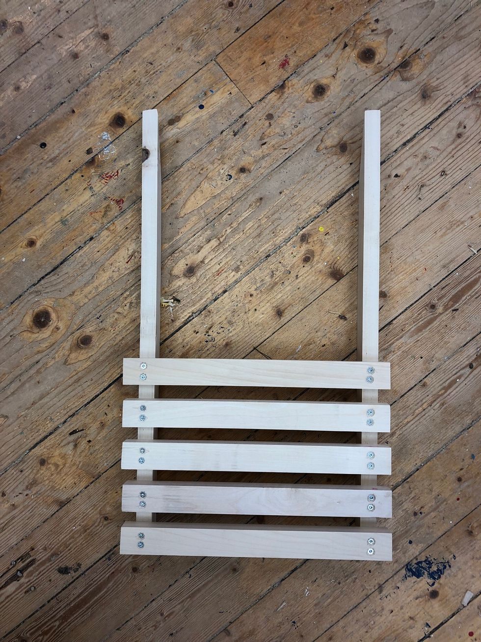 Lägg de rosa bitarna och spänn fast nästa bräda. Se till att de sitter jämnt på ena sidan