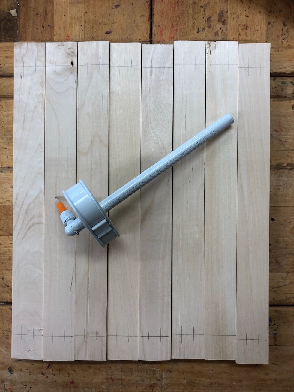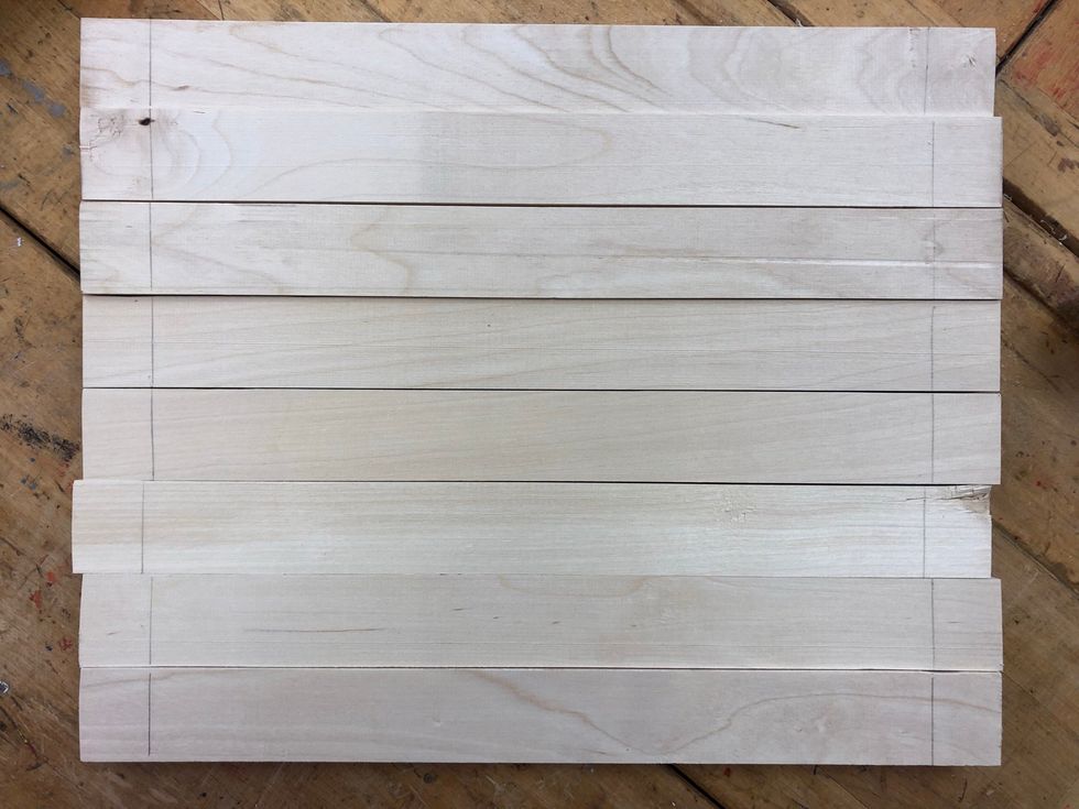 Se till att fem korta bitar är exakt lika långa. Lägg dem på bänken, putta ena änden med en linjal och spänn fast med en eller två tvingar.