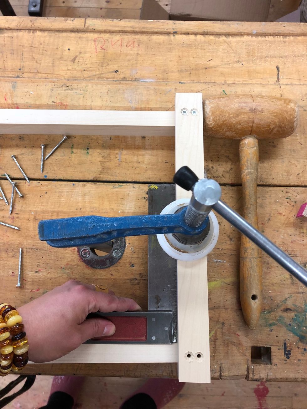 Nu behöver du 1. Vinkelhake 2. Träklubba 3. Skruv 4. Bänktving 5. Två rosa avståndsbitar 6. Bitts och bittshållare