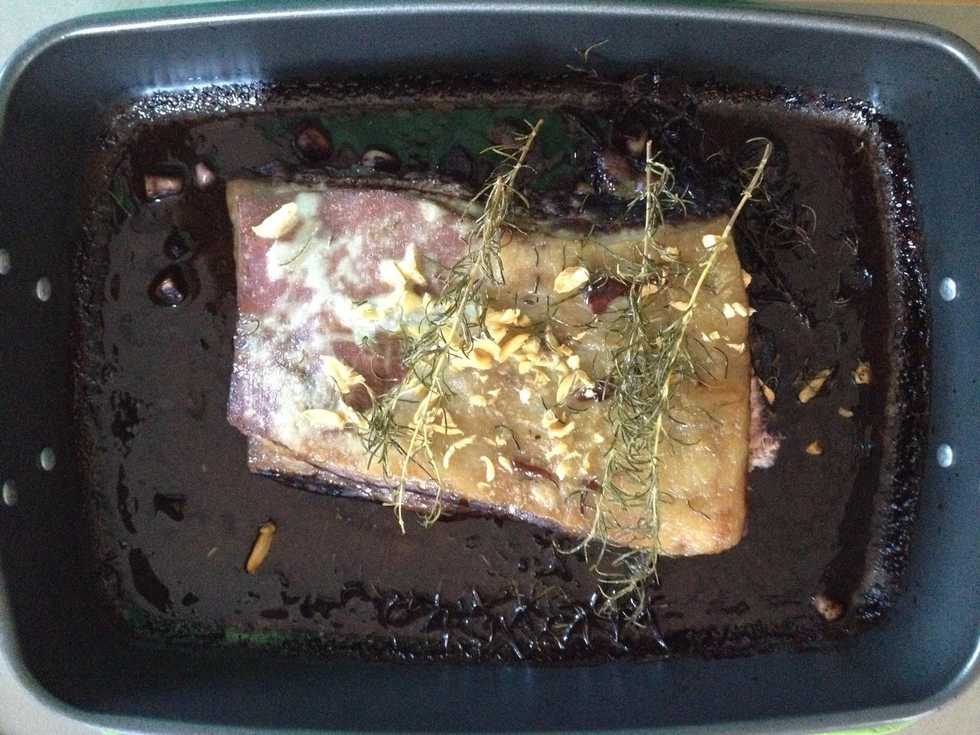 Place brisket in pan. Add garlic and rosemary. Pour enough wine to so that the brisket is half submerged. Preheat oven to 250C and place pan into oven. Immediately drop to 90C for 9hours