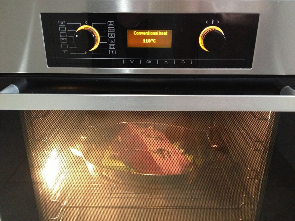 Slit Roast in places and insert garlic cloves and fresh thyme. Place roast onto bed of celery. Drizzle with olive oil, salt/pepper and splash red wine all over meat. Pour in 1 cup of water to base.