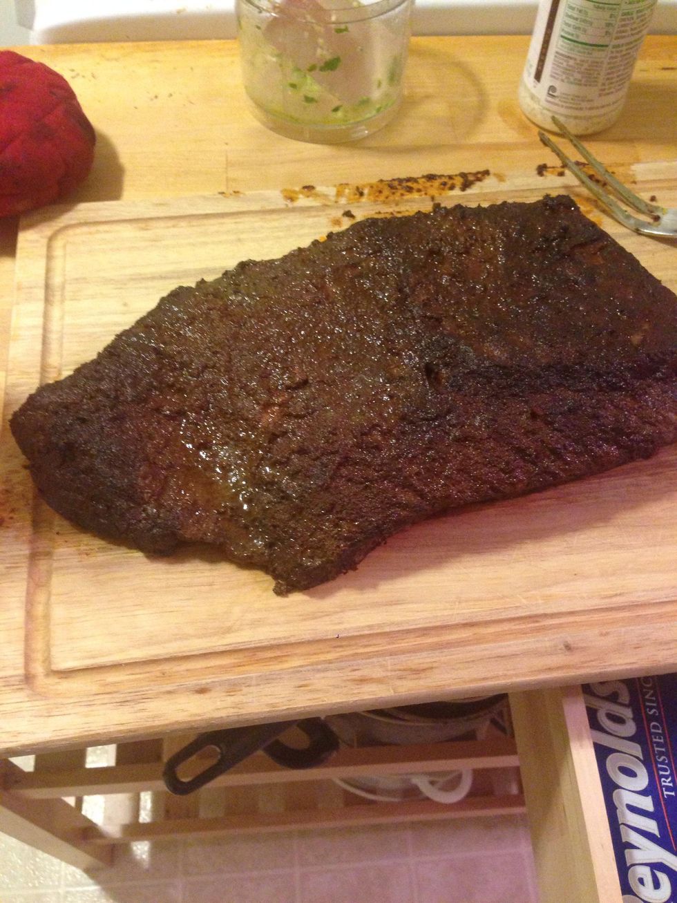 After the brisket finishes (6 hours at 225, 8 hrs at 190 Fahrenheit), take that sexy piece of meat out.