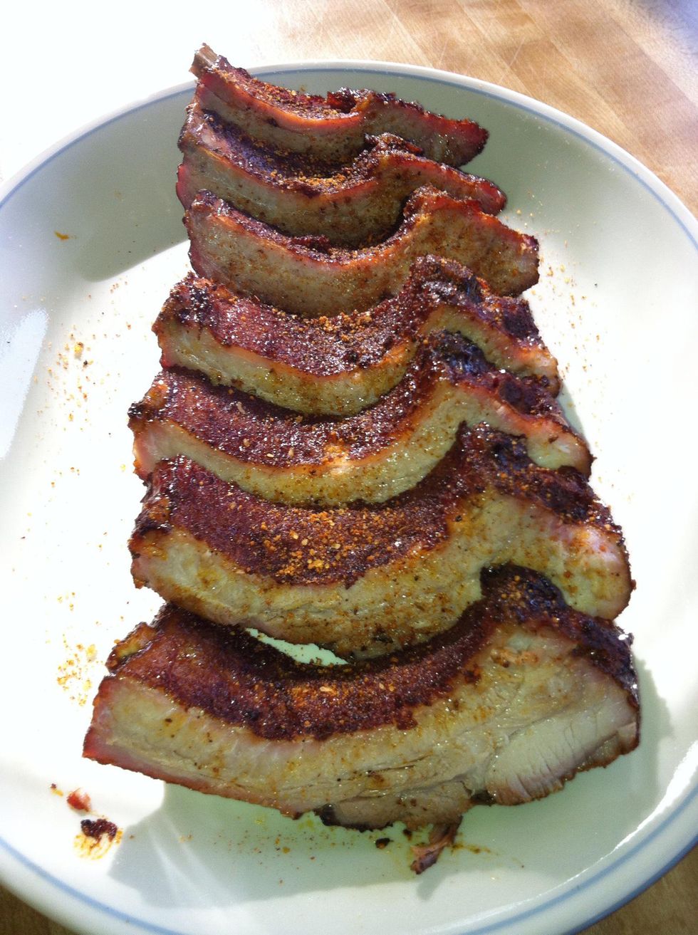 Cut the rack into individual ribs and sprinkle a pinch or two of the rub on top. Enjoy...no sauce required!