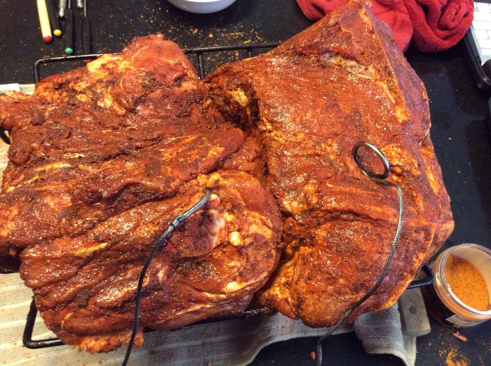 I place a thermometer probe inside the butt and connect it to the transmitter. The probes need to measure the temp in the center of the butt. This will determine if it has cooked through.