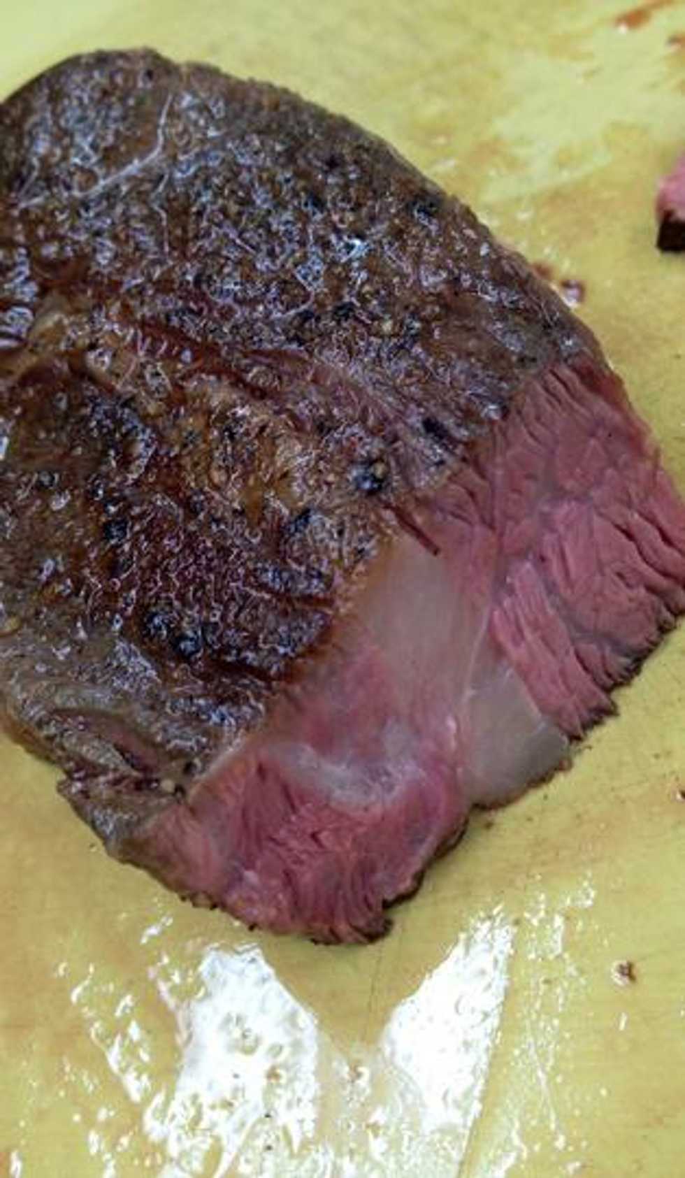 Cooked to exactly 135F (57C). Tender, but firm, and all the fat pockets are intact.