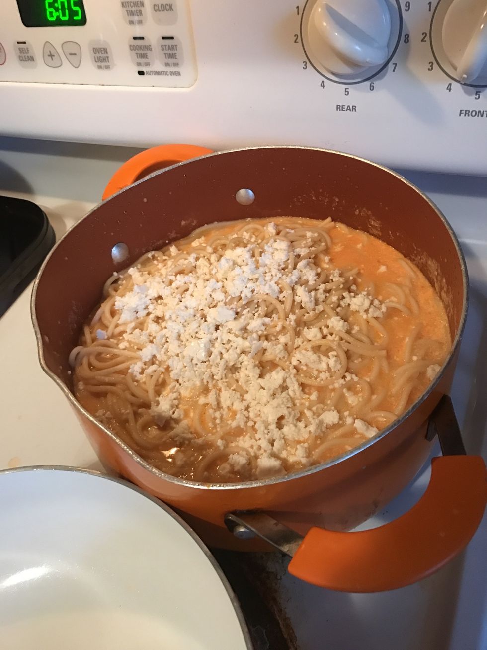 Two pots of boiling water: 1. For the pasta- add drizzle of EVOO, a garlic and a piece of onion 2. Just plain water for tomatoes