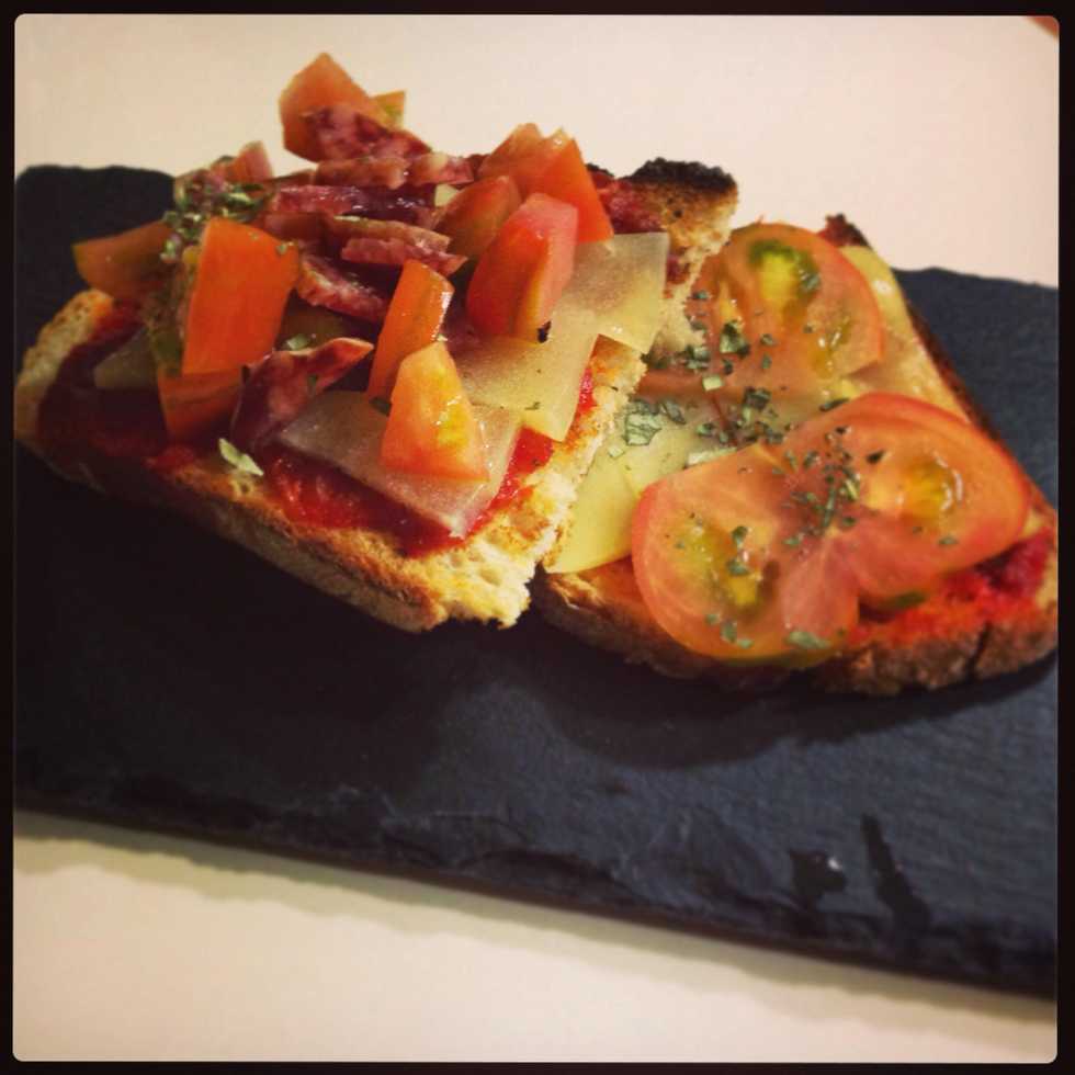 Bread Sobrasada ( chorizo paste) Tomato raff Chesse manchego Spanish fuet ( sausage) Olive oil Albahaca