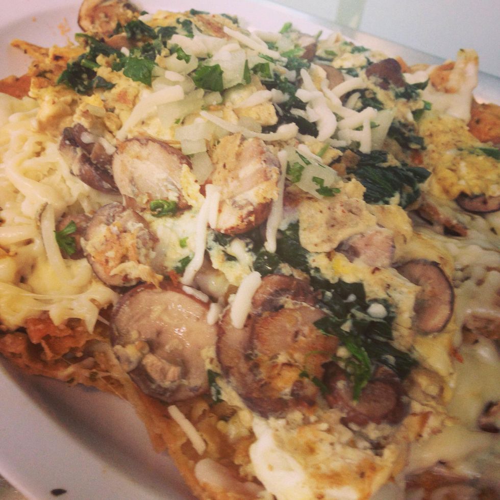 Place the spinach egg on top of tortilla. Add onion,cilantro, tomatoes, or tapatío in it and Your chilaquiles ready to be eaten 😋🍴