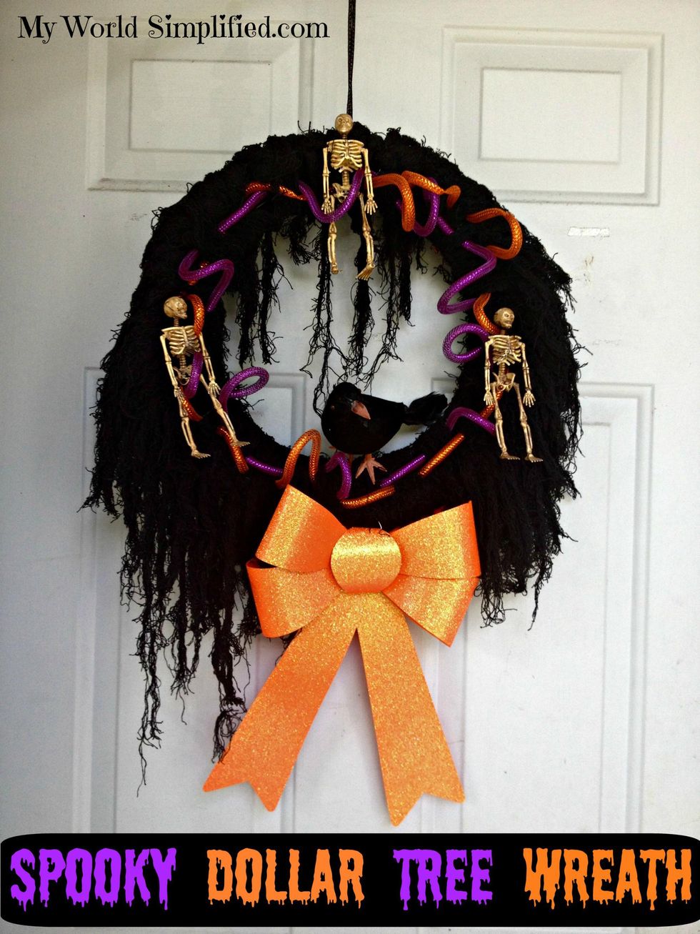 Take the mesh tubing and weave it in and out of the ties on the metal wreath. I left loops. Cut the skeletons loose and tuck 3 of them in. Tuck in the orange bow and add a bird. Hang and enjoy!