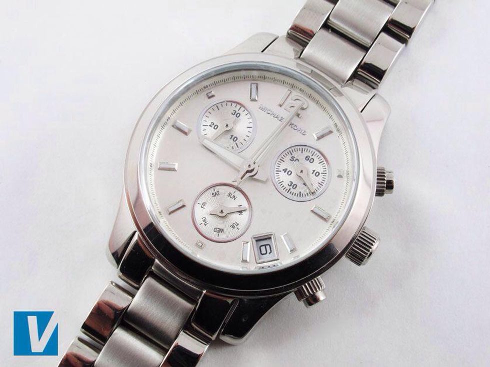 The Michael Kors logo is featured on the dial. Check that the font of the letters is consistent with the official brand logo, that the spacing is even, and that the quality of finish is high.