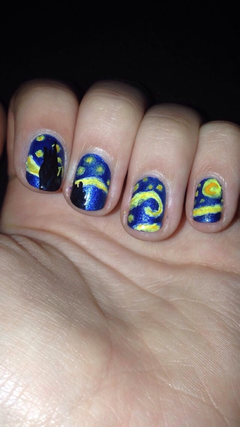Then I put yellow dots for the stars (one large one on my pinky for the moon) using a stippling motion, to make it look less like a definite dot
