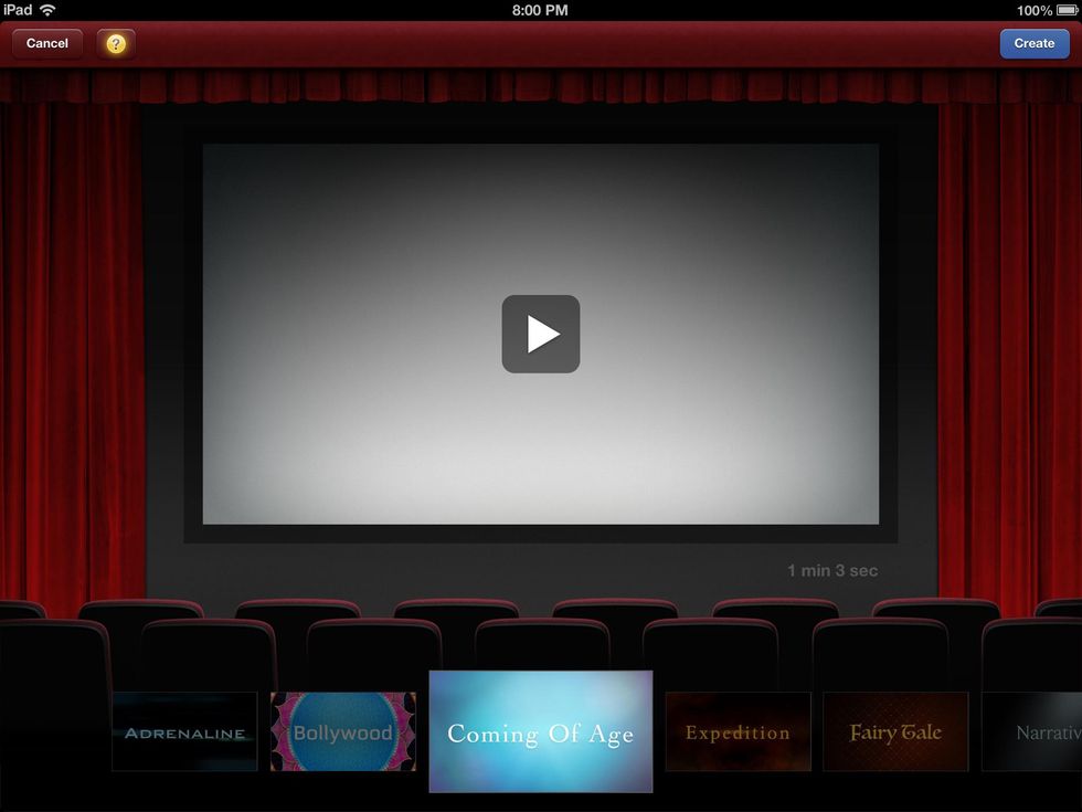 This is the home a screen for iMovie. To get more information , select the ? Take a minute to check out the features. When you have selected you template , click the blue Createbutti .