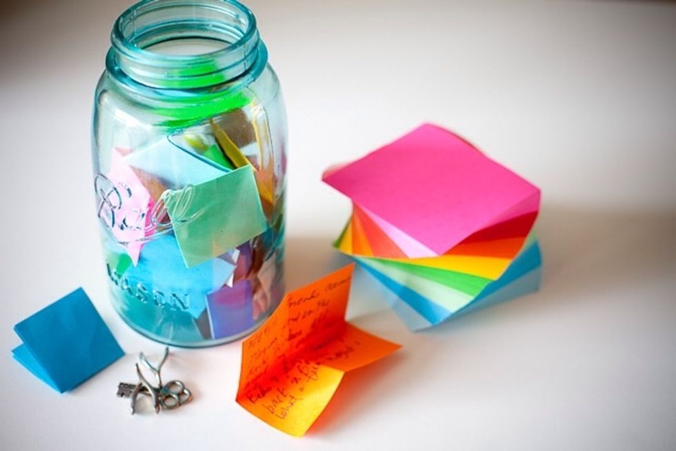 Another idea is to fill a jar with slips of paper, and every day write one good thing that happened to you. It might be as small as the temperature being perfect; it doesn't matter.
