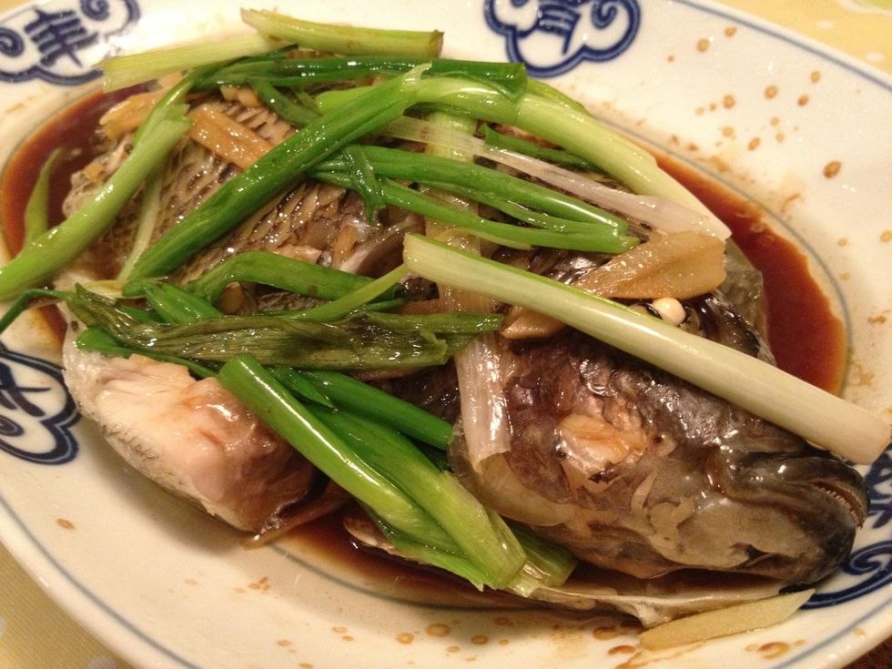 Take the fish out of refrigeratorA Giant SteamerAdd water to steam fish Bring water to a boilPlace slice ginger on top of fish and a couple of pieces inside the fish bodySlice the scallion and cut about 1" piecesSteam Fish Cooking with Mom