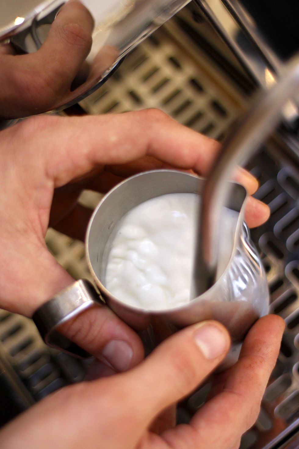 Next, stick the wand just under the surface of the milk and turn it on. Allow the wand to "breathe" in the milk, incorporating small amounts of air as you heat.
