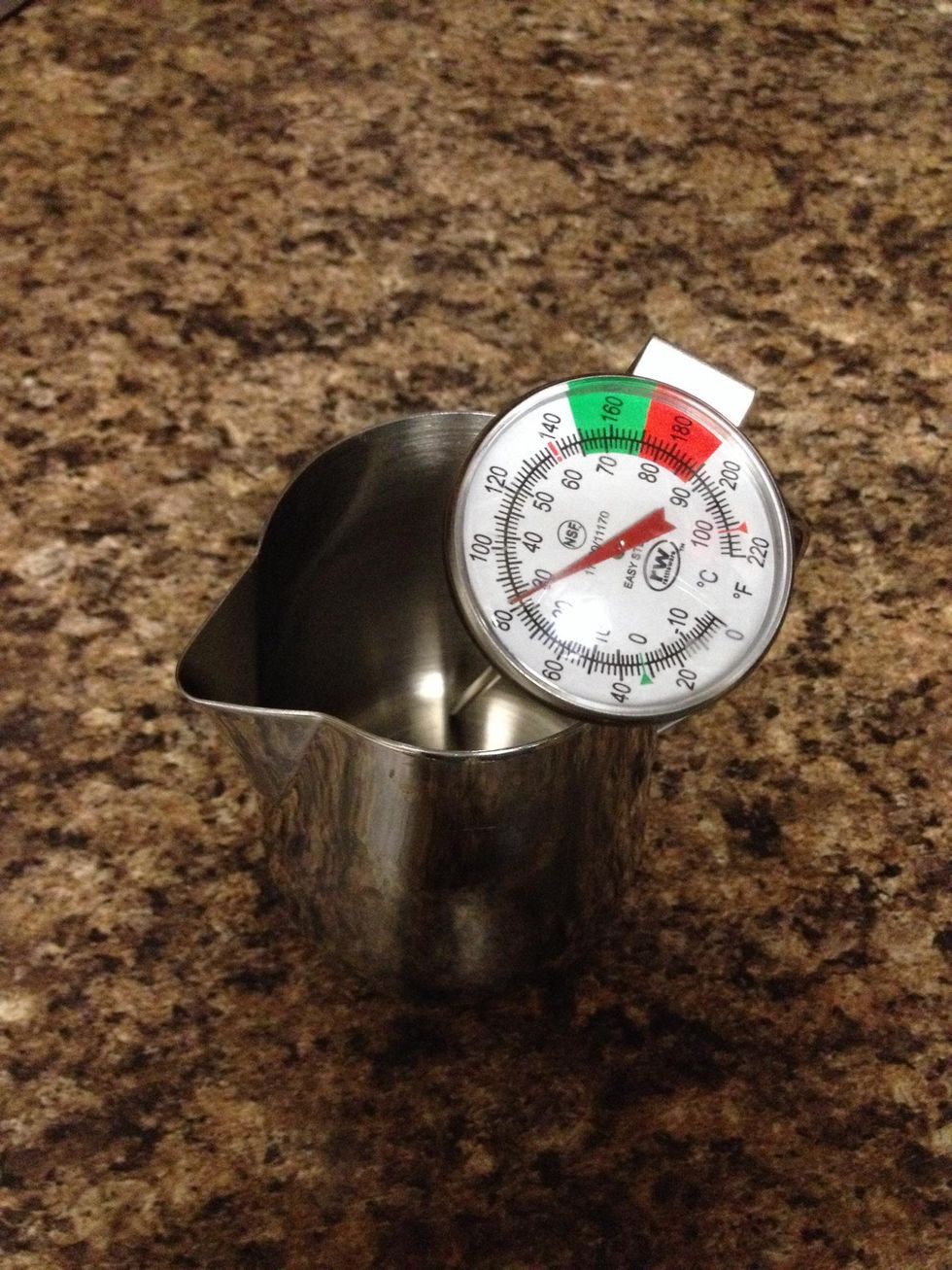 I use a 12-ounce pitcher and a thermometer, both from Rattleware. You can use a larger size if you want, but I think this is an easier size to control—and the perfect amount for a latte!