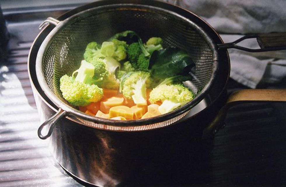 3. After a minute and a half, prick all the vegetables with a knife to test them. The green ones should be closer to done than the others. If they seem ready, the steaming is done!