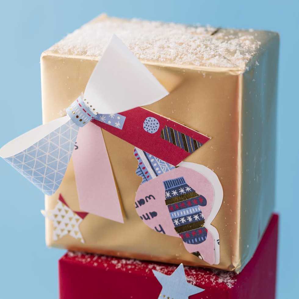 Arrange other shapes on presents. Get creative with your design! Glue shapes on presents.