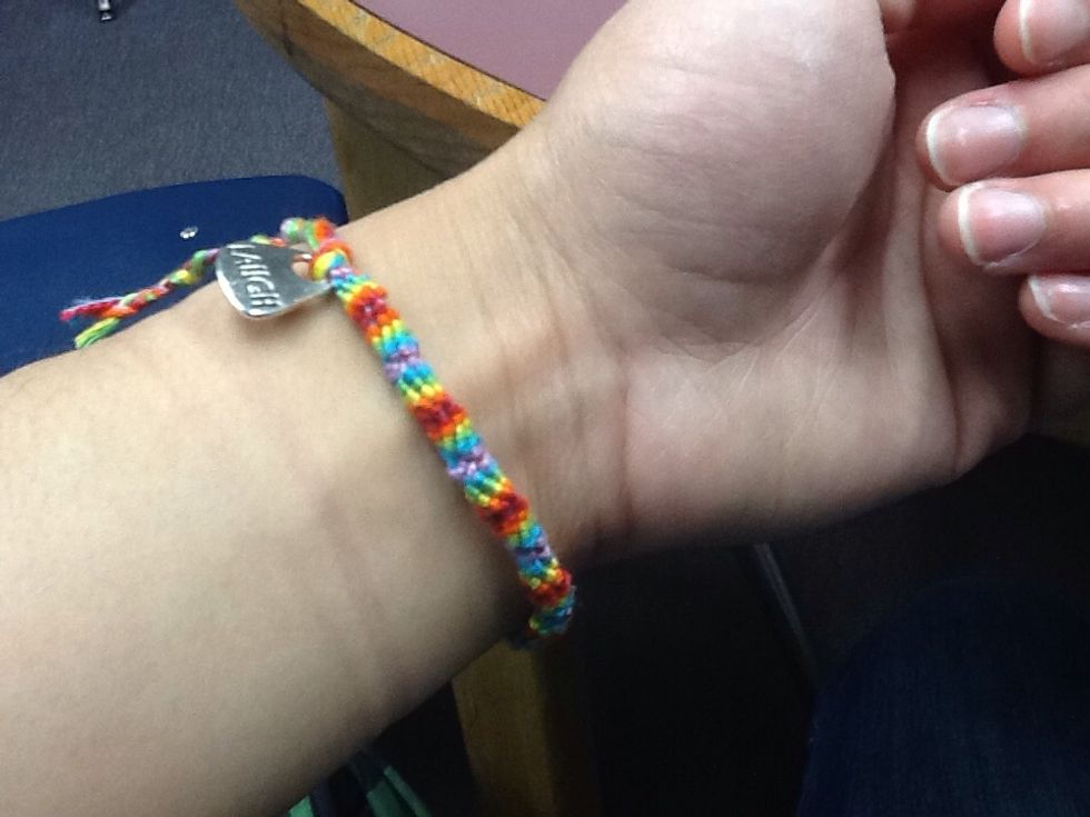 Repeat this step knotting the red string over the other colours (yellow, green, blue, and purple) until the red string is all the way to the right.