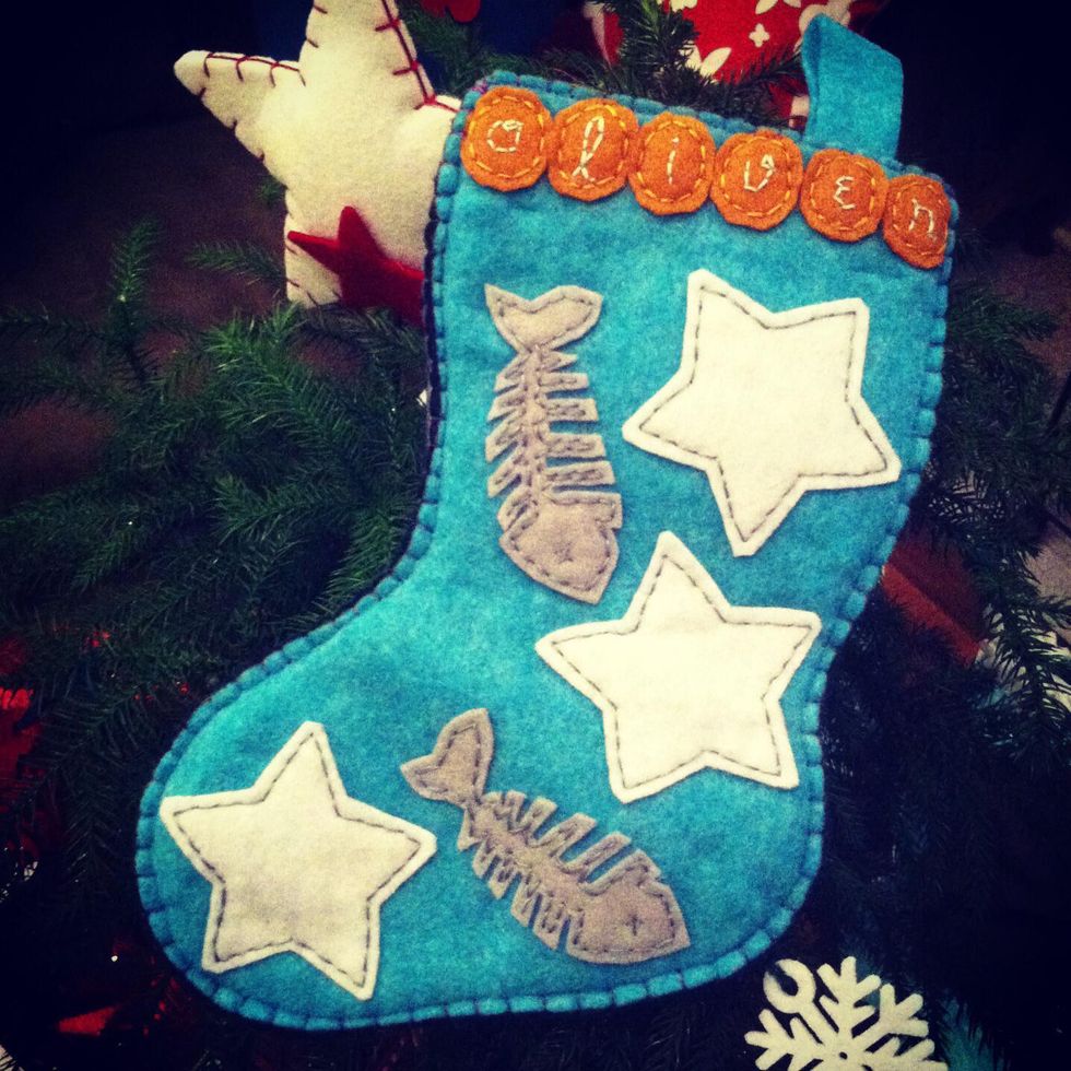 I then used embroidery thread to stitch my design onto the front of the stocking. I added the cat's name along the top using a font called 'Noodle Script'. I added a folded piece of felt for hanging.