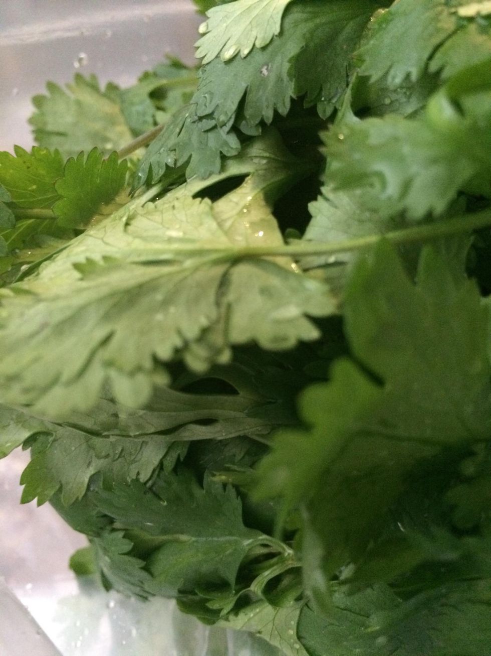 Grab a bunch of fresh cilantro and keep the tie on. It will help keep the bushel manageable.