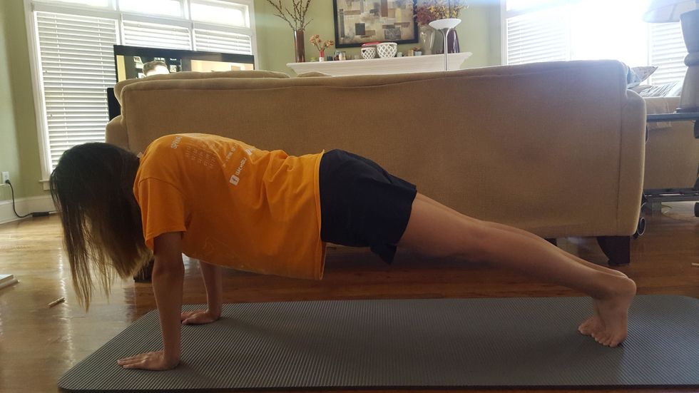 Moving onto a harder plank, complete 2 sets of high planks on your hands. Keep hands below your shoulders and keep back straight as usual. Repeat for 2 sets of 1 minute each.