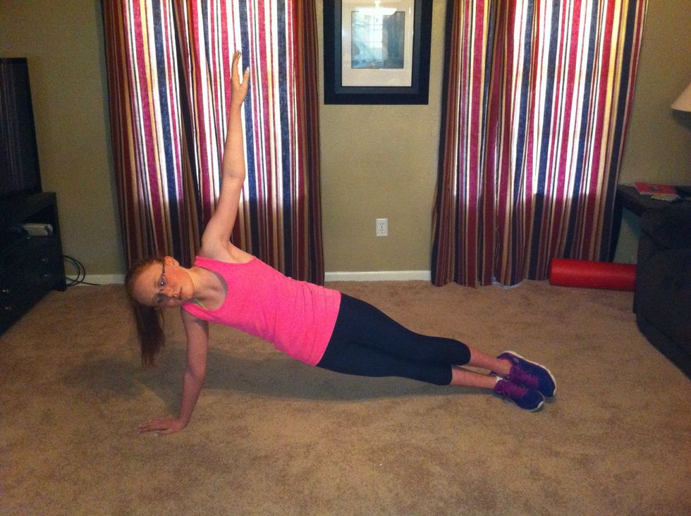 For side plank, lie on side and support upper body with forearm. Stack feet. Raise hips off floor keeping back straight and hold for 5 counts. Repeat 5 times. Change sides and repeat.
