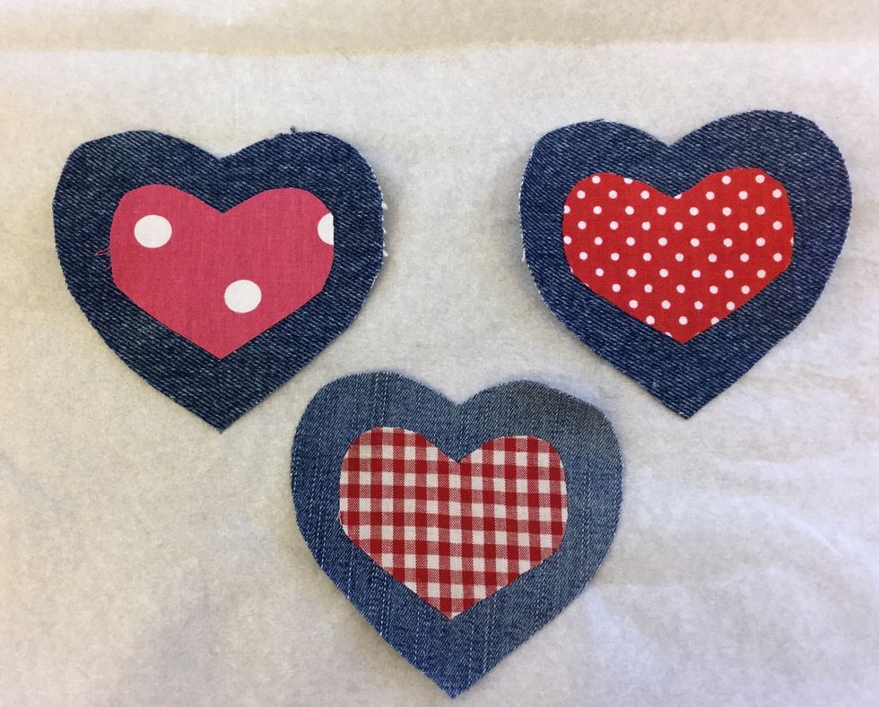 Nu sitter tygbitarna på jeansen och klar till att sy fast med en fin sömnad.