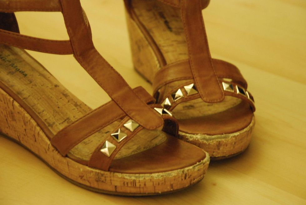 Supplies used. I studded a pair of wedges from a garage sale. I recommend practicing before you stud the shoes because removing and restudding is a difficult process.