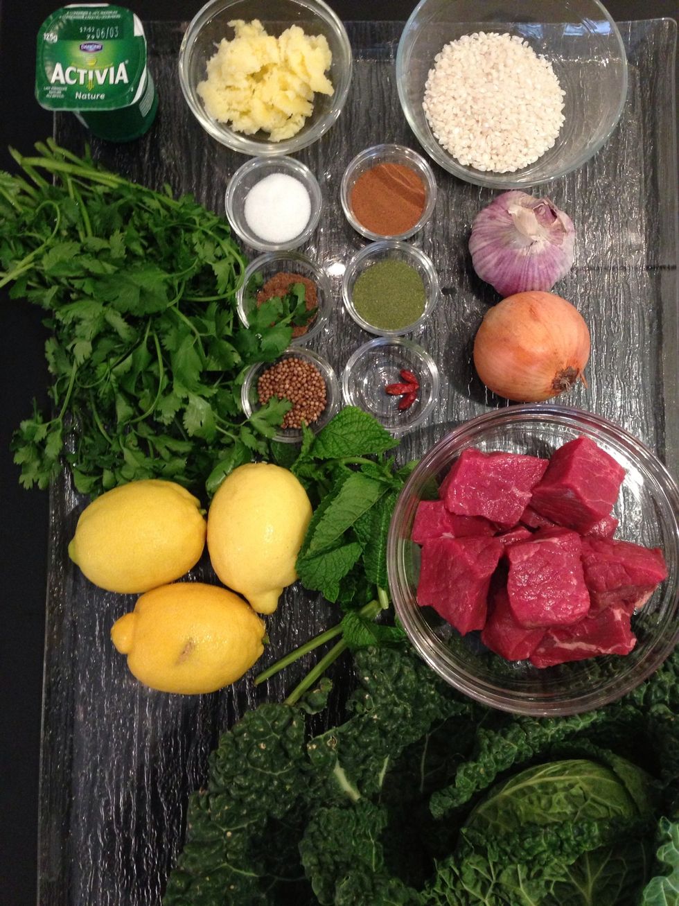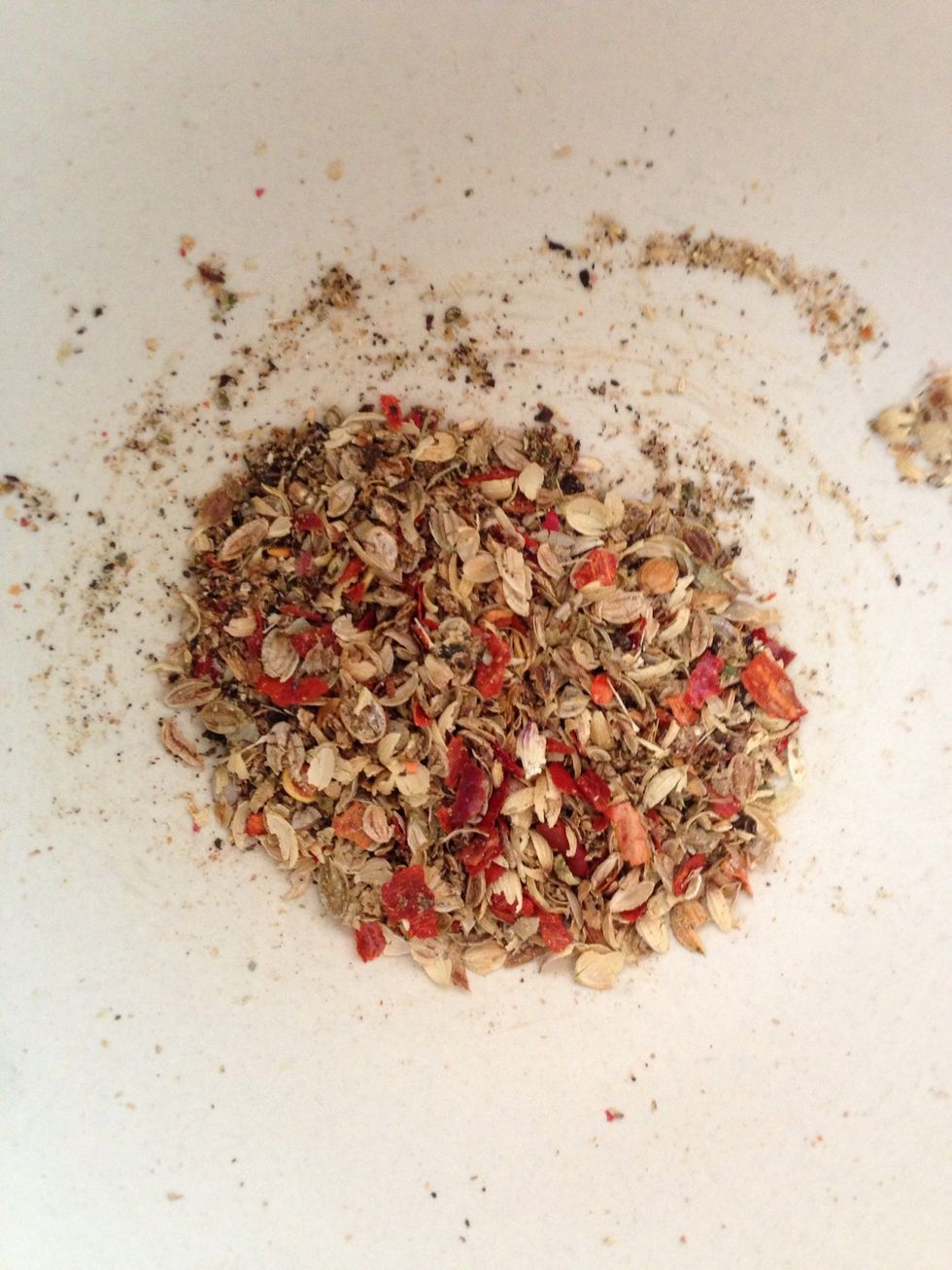 Spices that will give the distinctive taste of this recipe. Dried mint, coriander seeds, cinnamon, seven spices, salt and some chili flakes.