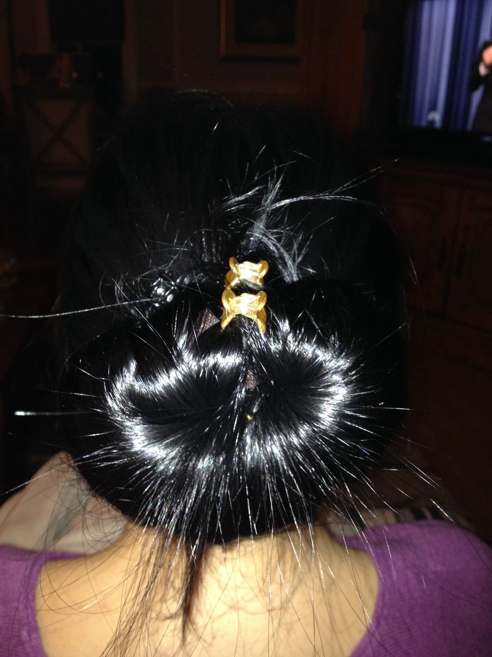 Secure the part where hair doesn't want to lay with two colorful clips like I did to complete the bun๐๐